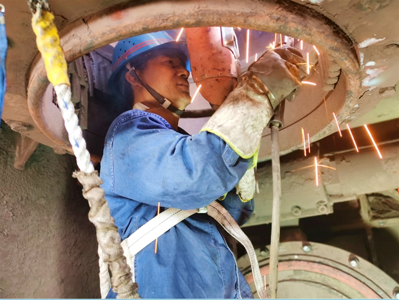 在現(xiàn)場(chǎng),鉗工劉建軍綁好安全帶,快速進(jìn)入到不足四平方米的閥箱開(kāi)始受限空間作業(yè)。他認(rèn)真查看著料斗的每一處刷槽現(xiàn)象,接過(guò)精細(xì)制作的10公分六棱鋼,一點(diǎn)一點(diǎn)將六棱鋼卡槽焊接牢固。一根、兩根、三根……伴隨著六棱鋼越來(lái)越多,劉建軍頭上的汗水不斷涌出,流進(jìn)眼睛里。只見(jiàn)他用袖口簡(jiǎn)單抹了一把汗,又接著檢查沖刷口……一干就是20多分鐘。