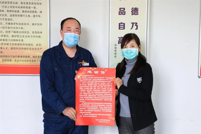 捐贈現(xiàn)場,公司市場營銷部相關(guān)領(lǐng)導(dǎo)代表公司對該單位表示感謝,并表示一定將捐贈物資全部用于一線職工,將合作伙伴這份愛心傳遞給龍鋼每一位員工。