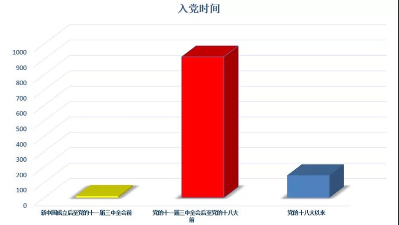 新中國成立后至黨的十一屆三中全會前(1978年12月18日)入黨的10名,黨的十一屆三中全會后至黨的十八大前(2012年11月8日)入黨的916名,黨的十八大以來入黨的145名。