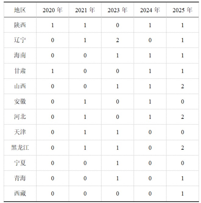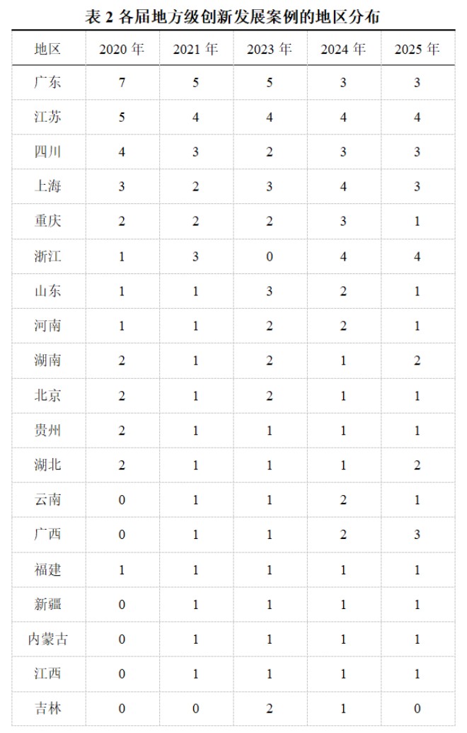 各屆的地方級(jí)案例數(shù)量見表2所示,廣東省案例總量排名第一,為23個(gè),但各屆的案例數(shù)量整體呈下降趨勢(shì);江蘇省案例總量排名第二,為21個(gè),各屆案例數(shù)量保持穩(wěn)定;四川省、上海市的案例總量并列第三,各屆數(shù)量均較穩(wěn)定;浙江省案例總量排名第五,近兩年入選案例數(shù)量增加。